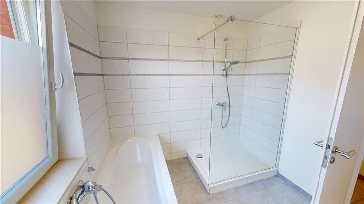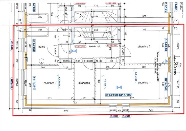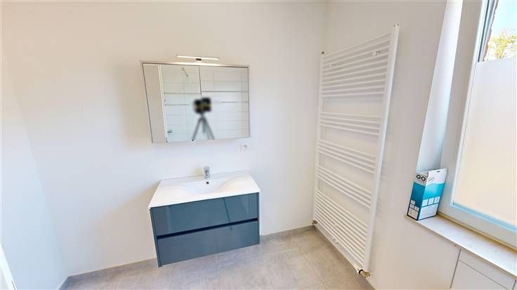 1er ét.: hall de nuit (+/-4 m²), 3 chambres (+/-19, 12 et 11 m²), salle de bains (+/-8 m² avec baignoire, douche, meuble lavabo et radiateur sèche-serviettes), buanderie (+/- 6 m²), 1 w.c. (+/-1,5 m²)