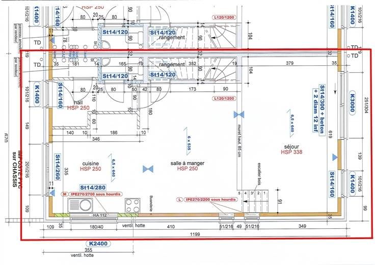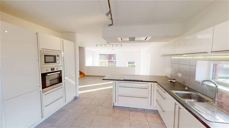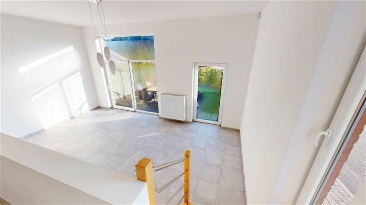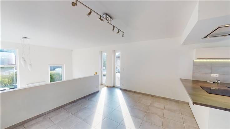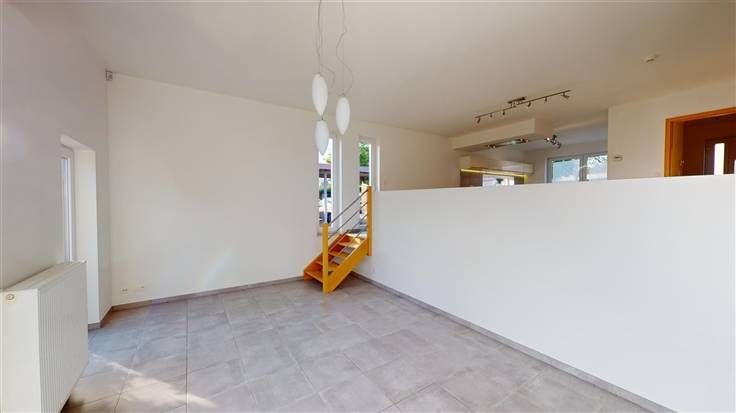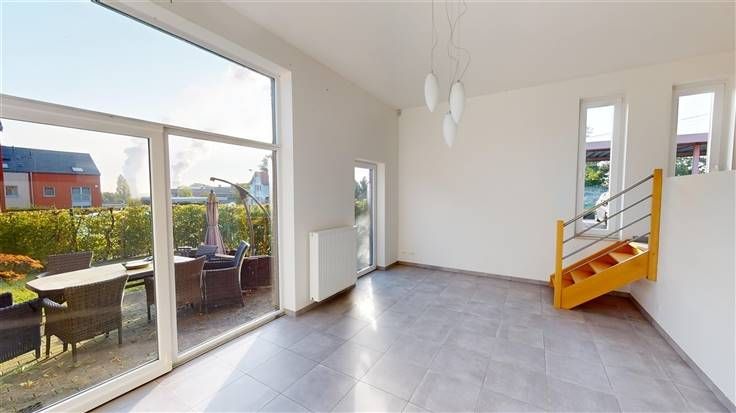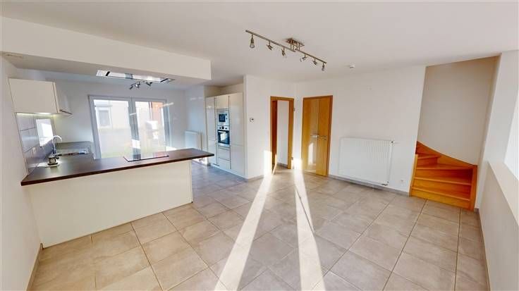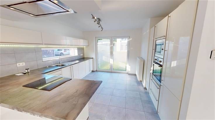 Rez : hall d'entrée (+/-5 m²) comprenant 1 w.c. avec lave-mains (+/-1,5 m²) et 1 débarras (+/-1,4 m²), spacieuse salle à manger (+/-20 m²) ouverte sur la cuisine équipée (+/-13 m² avec taque vitrocéramique, four encastré, four micro-ondes, hotte, frigo/congélateur, lave-vaisselle, meubles évier et de rangement), salon (+/-23 m²) avec accès à la terrasse et au jardin.