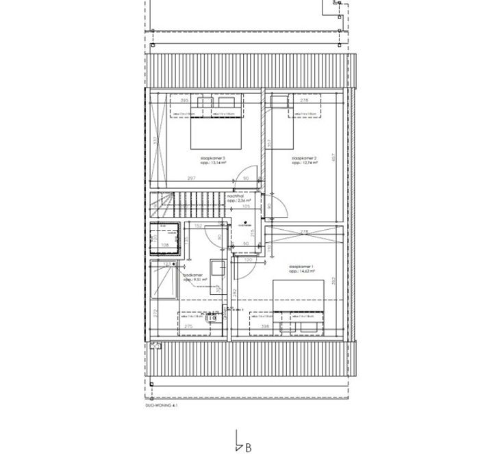 Via de trap bereiken we de tweede verdieping die toegang geeft tot 3 ruime slaapkamers, badkamer met dubbel lavabo, toilet en inloopdouche. Extra troef is de overdekte autostaanplaats met privéberging aan €50/maand (mogelijkheid om er twee te huren). Verder gebruik van de gemeenschappelijke delen zoals de tuin, gemeenschappelijke fietsenberging,...