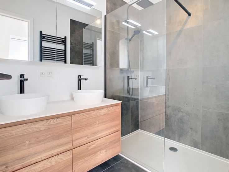 Gelegen in Jezus Eik, vlakbij het Zoniënwoud en vlakbij winkels, de Brusselse ring en de E411: aangenaam en licht NIEUW APPARTEMENT/DUPLEX gelegen in een luxe gebouw op de 1ste en 2de verdieping. Oppervlakte van +/-90m² + 6m² overdekt terras aan de straatkant, zonder inkijk en gericht naar het zuiden. Het appartement bestaat uit een inkomhal met toilet en lavabo - ruime woonkamer + eetkamer +/-42m² + super ingerichte open keuken met eiland - bijkeuken/achterkeuken. Boven: 1 slaapkamer +/-35m² - douchekamer met aparte douche en 2 wastafels - privékelder - parking voor 1 wagen - terras/balkon + gemeenschappelijke tuin - alarmsysteem - vloerverwarming - warmtepomp - regenwatertank - zonnepanelen - thermische en akoestische dubbele beglazing - maandelijkse kosten: 180€ (elektriciteit voor gemeenschappelijke ruimtes, water, tuinonderhoud) - PEB A - beschikbaar