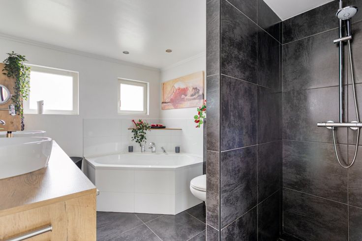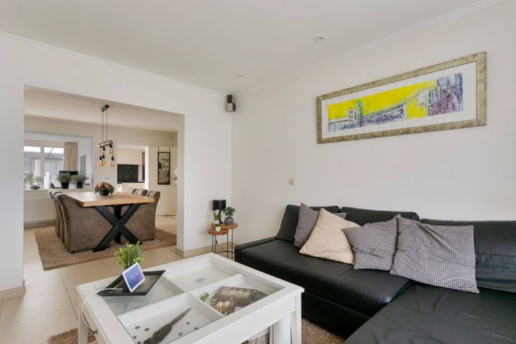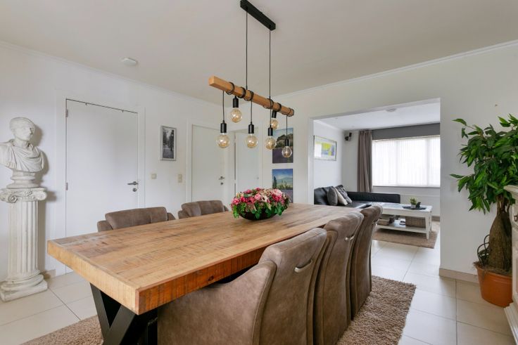 We betreden de woning via de inkomhal en komen vervolgens in de leefruimte welke opgedeeld is in een eetgedeelte -en zitgedeelte. Verder in de woning vinden we de aanbouw waar zich nog een extra eetruimte bevindt dat geïntegreerd is bij de keuken. Ook de badkamer is gelegen op het gelijkvloers en is proper uitgerust met een dubbele lavabo in meubel, bad, inloopdouche en toilet. Achteraan de woning kan je in de veranda genieten van het uitzicht over de tuin.