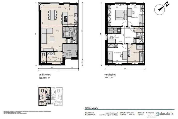 Durabrik zal hier 7 woningen bouwen, 6 halfopen en 1 open bebouwing. Centrale ligging, dichtbij de invalswegen en het het centrum van Sint-Ulriks-Kapelle op wandelafstand (school vlakbij). Vloerverwarming, warmtepomp lucht/water, Ventilatiesysteem D, zonnepanelen, regenwaterput 10000l. Op lot 3 wordt een energiezuinige lichtrijke woning gebouwd in moderne architectuur op een grondopp. van 585m² en met een totale bewoonbare oppervlakte van 151m² op de 1e en 2e verdieping. GELIJKVLOERS: inkom, gastentoilet, lichtrijke ruime leefruimte, open volledig uitgeruste keuken met zicht op tuin. Aansluitend aan de keuken is er een wasplaats. Aparte ingang van de voorzijde naar (fietsen)berging. Grote zonnige tuin. EERSTE VERDIEPING: 3 ruime slaapkamers, open bureauruimte, een aparte wc, een badkamer ingericht met ligbad, inloopdouche en badkamermeubel met dubbele lavabo. Technische berging. De woningen in deze verkaveling worden VOLLEDIG AFGEWERKT aangeboden: met een ingerichte keuken , badkamer (met douche, ligbad en dubbel lavabomeubel), 2 toiletten, deuren en vloeren. Adres: Hoppeweg, Sint-Ulriks Kapelle Prijs excl. btw en kosten. Meer info via 09 280 60 60 of info@durabrik.be.* Afbeeldingen en oppervlaktes zijn indicatief Renovatieplicht: nee