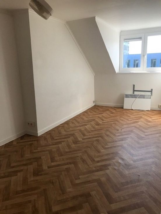 Ongemeubeld en zeer ruim duplexappartement ( 113 m2 )in een herenhuis bestaande uit : ruime living met grote raampartijen, volledig ingerichte keuken, badkamer met inloopdouche en lavabomeubel, apart toilet en op het verdiep : 3 slaapkamers.