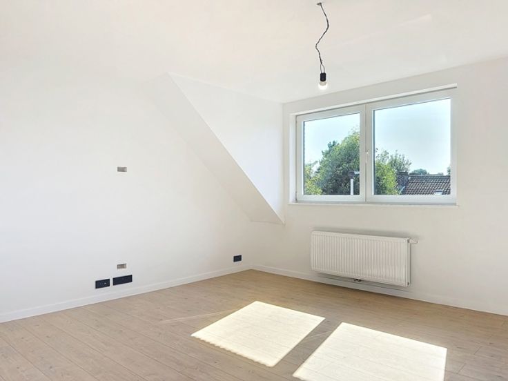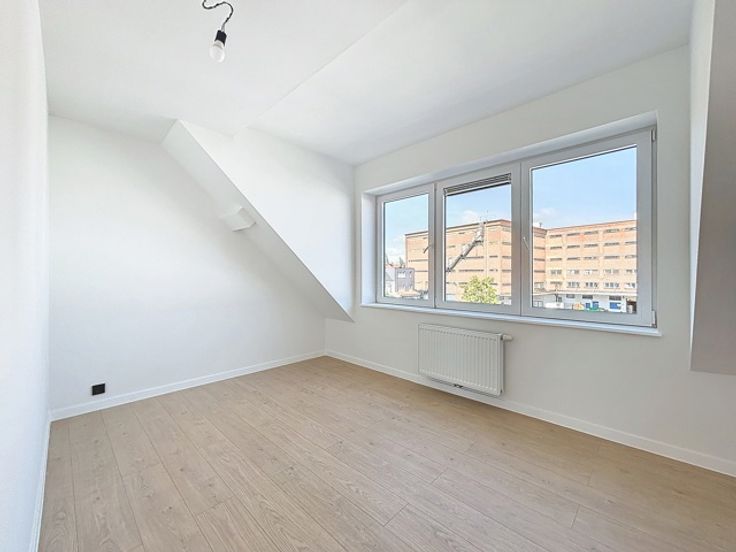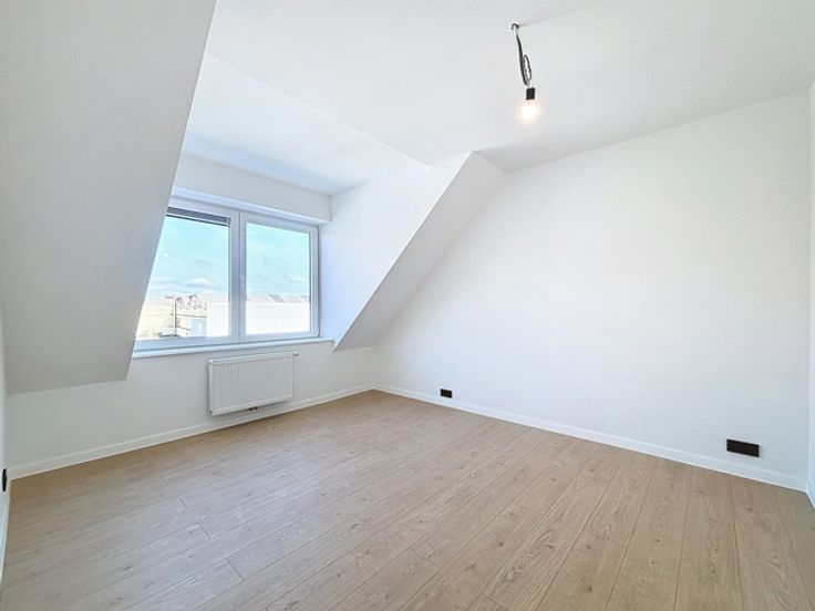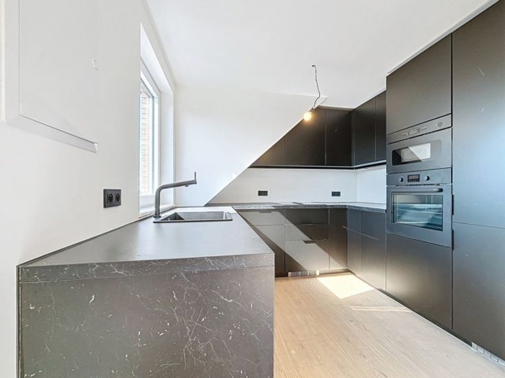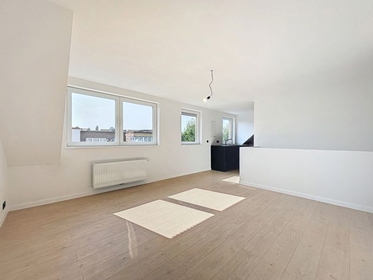 Un living, une cuisine ouverte super-équipée, deux chambres +-11m2 et +-13m2, une grande salle de douche de +-6m2 avec WC ainsi qu'un espace buanderie.