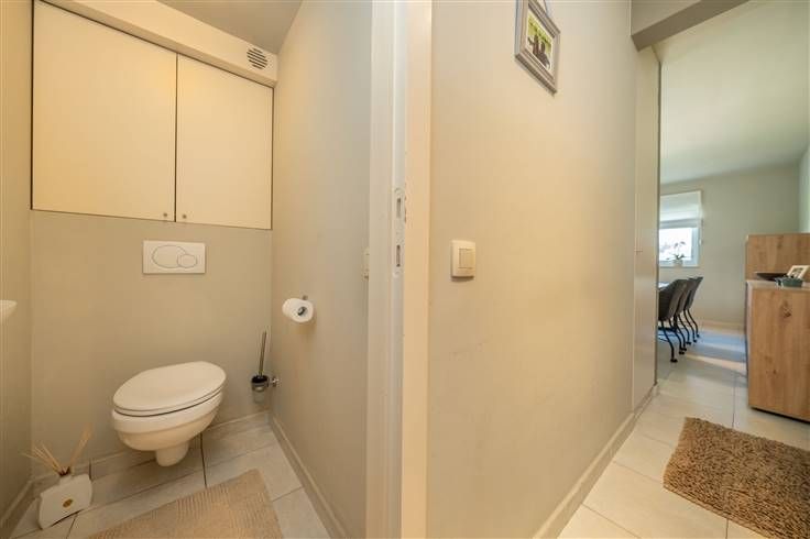inkomhall (1m30x2m35), hang-WC met wastafeltje, sas (1m00x1m05) leidend naar de leefruimte, mooie leefruimte met een open, ingerichte keuken (samen 32m2), aangenaam terras (1m60x2m85) met zicht op groen en zonder inkijk, slaapkamer (3m10x3m25) met ingebouwde kast, badkamer (1m80x1m85) met ligbad/douche en meubel met wastafel, opberghok met de stookketel, ruimte met de aansluitingen voor wasmachine en droogkast