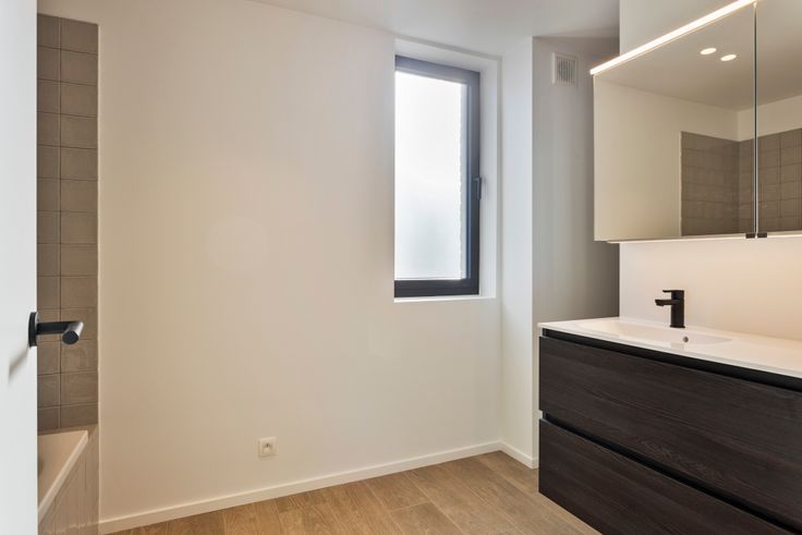 Weer zo’n schoontje in verhuur! Het zal eerste bewoning zijn voor dit nieuw gezet huis.Half-open met oprit én een handige fietsenberging, netjes ingewerkt in de zijgevel.Via de zij-inkom kom je de woning binnen. Achterin met zicht op de tuin een strak, ingerichte witte keuken met eethoek. De behapbare tuin is mooi van oppervlakte.Wat deze woning zo leuk maakt, zijn de halve verdiepen. Halfje naar beneden en je komt terecht in de vestiaire. Hier nog een apart toilet én een praktische berg/wasruimte. Op de eerste verdieping met het snoetje aan de zonnige straatkant, de living. Achterin de slaapkamer met een oppervlakte 9,5 m2, de nachthal en badkamer met bad, inloopdouche, badkamermeubel met ingewerkte lavabo en strak spiegelkastje.
