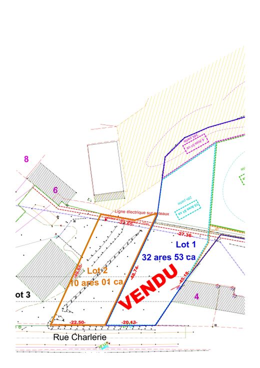 Beau terrain plat en contre haut par rapport à la voirie. Orientation Arrière Sud-Ouest, vue sur zone boisée et bâtiment agricole reconverti.