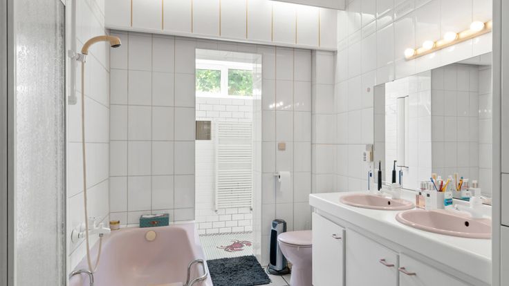 - Badkamer met bad, douche, toilet en dubbele lavabo