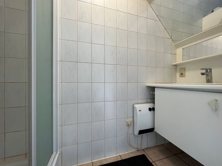 Via de hall bereiken we vervolgens een apart toilet, een ruime slaapkamer met ingemaakte kastwand alsook een ingerichte badkamer. Deze laatste is voorzien van een lavabomeubel en douche.