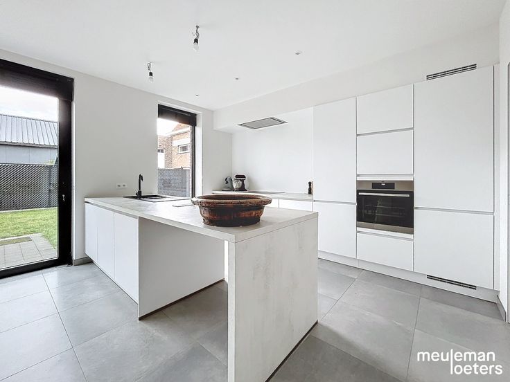 Een inkomhal met gastentoilet (inclusief lavabo), een zeer ruime en luchtige leefruimte met open keuken met eiland (voorzien van vaatwasmachine, keramische kookplaat, warmelucht oven, koelkast, dampkap en 1,5 spoelbakken en een wasplaats annex berging annex achter inkom annex technische ruimte.