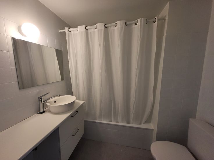 Ruime badkamer met wastafel en een ruim ‘werk’blad waaronder badkamermeubel en ruimte voor een wasmachine, verder ook ligbad/douche en een toilet.
