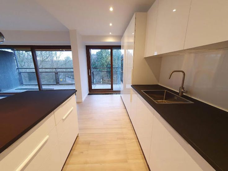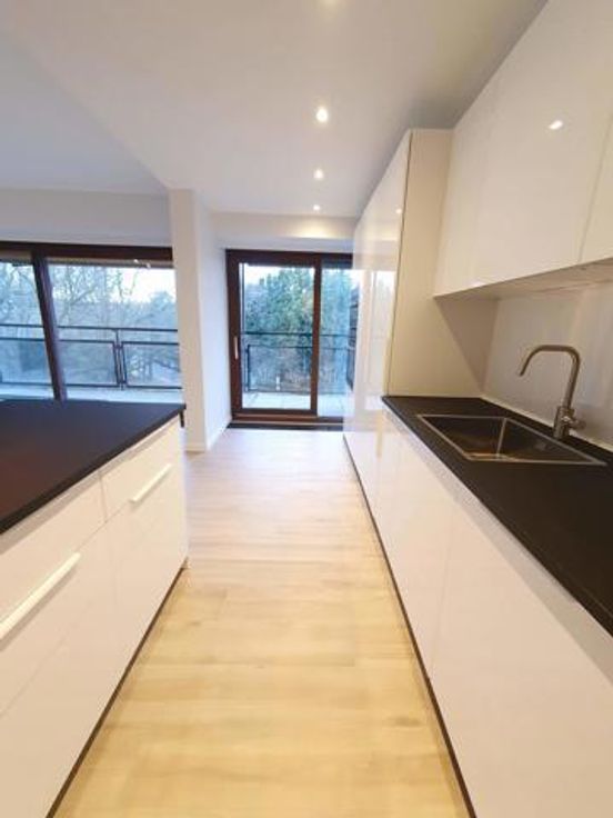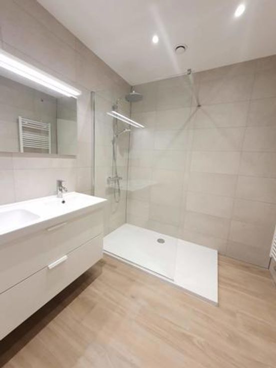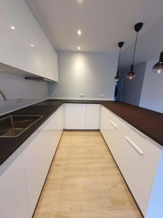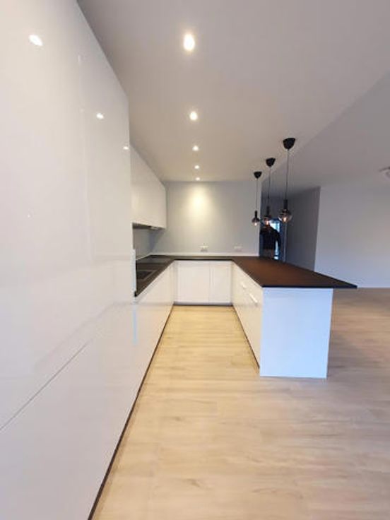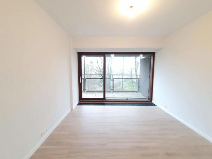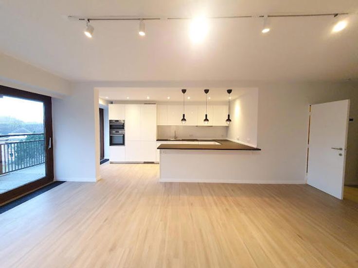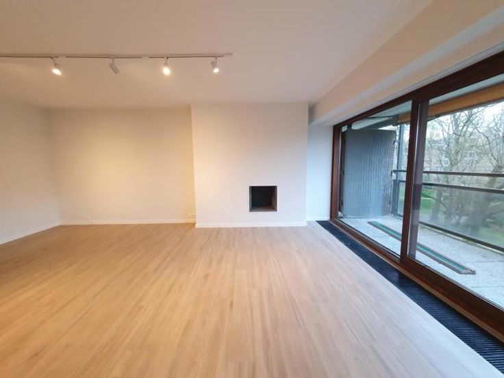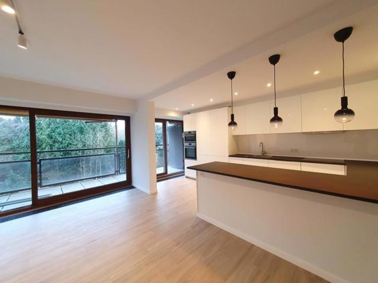 A proximité des commerces et dans un environnement verdoyant à proximité de la forêt, dans un immeuble +/-1960, très bel appartement entièrement rénové (2ème occupation) au 3ème étage avec grandes terrasses tant à l'avant qu'à l'arrière. Hall d'entrée ouvert sur le living sud et cuisine américaine super-équipée + équipement buanderie (machine à laver et séchoir) de belle facture, terrasse avant de +/- 10 m² assez profonde +/- 1.50 m exposée sud-ouest avec tente solaire, hall de nuit, wc séparé, 2 belles chambres équivalentes donnant sur terrasse arrière de +/- 10 m², dressing séparé, salle de douche neuve, cave. Garage Box fermé : 150 €. Charges : 250 € couvrant communs, chauffage et eau (provision) -