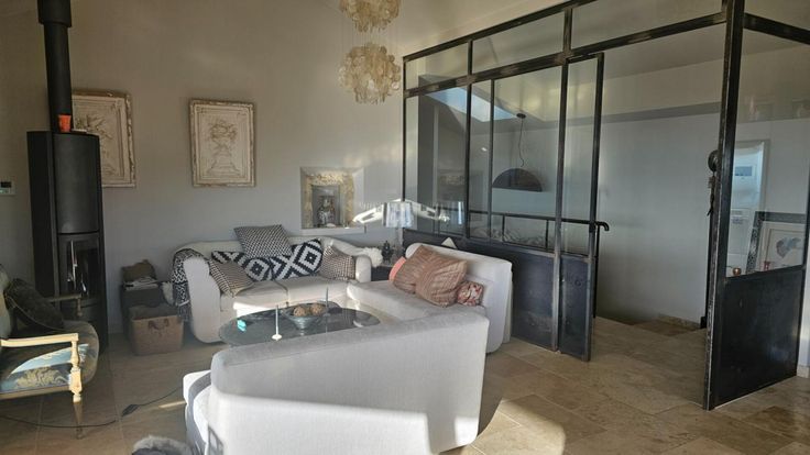 A l'étage se trouve un salon/salle-à-manger/cuisine ouverte équipée donnant sur une grande terrasse est notamment chauffé par un poêle à bois, 2 chambres avec leurs salles d'eau. Beaucoup de grands placards.