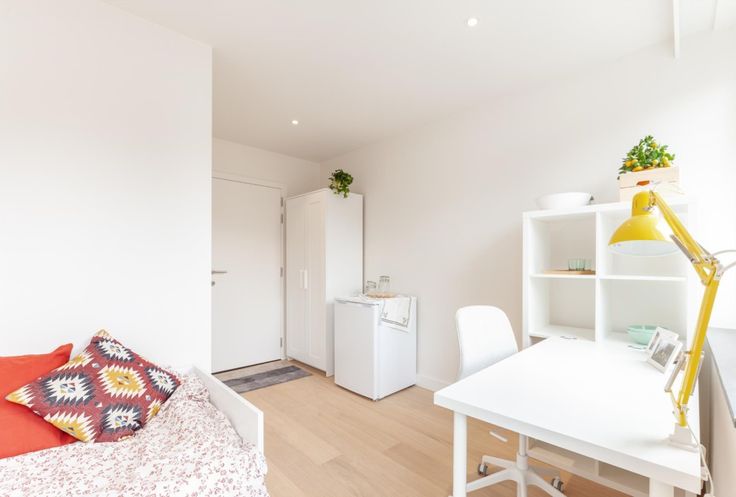 De kamer wordt standaard bemeubeld (enkel bed zonder matras, bureau, bureaustoel, kleerkast, koelkast).