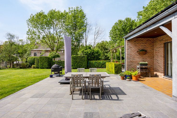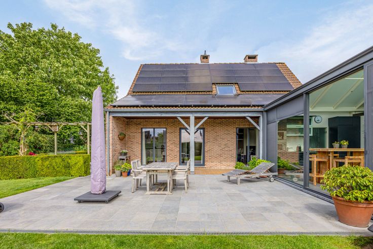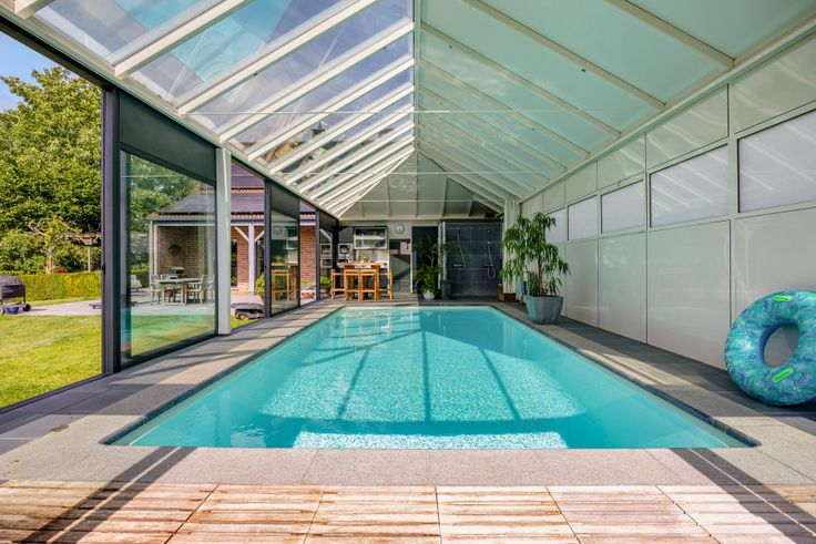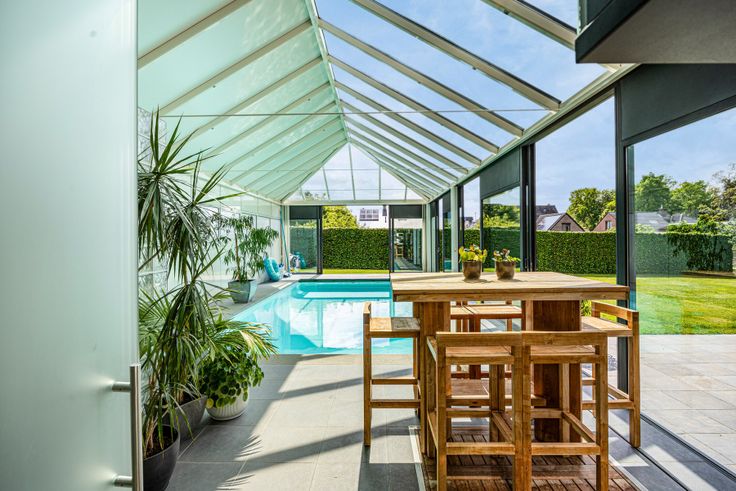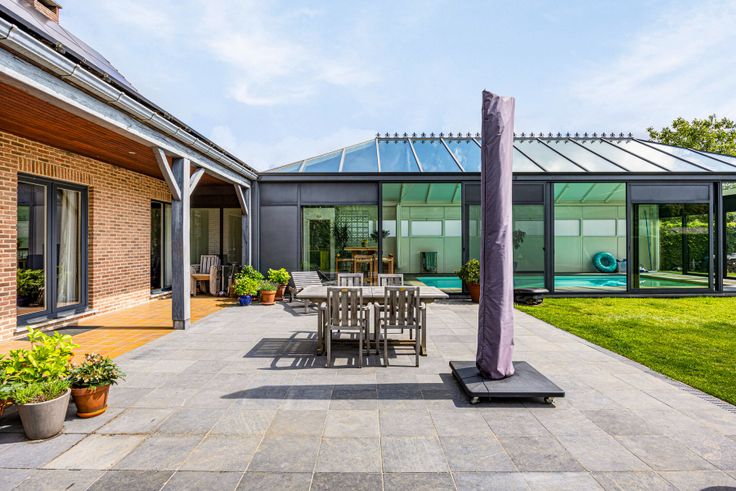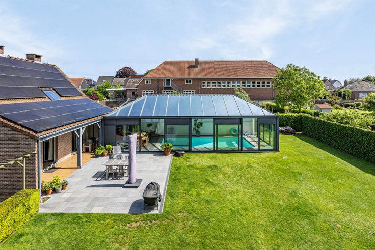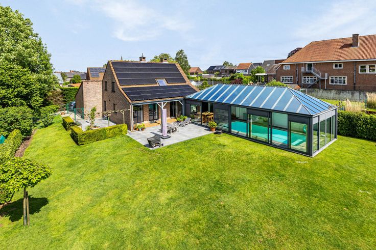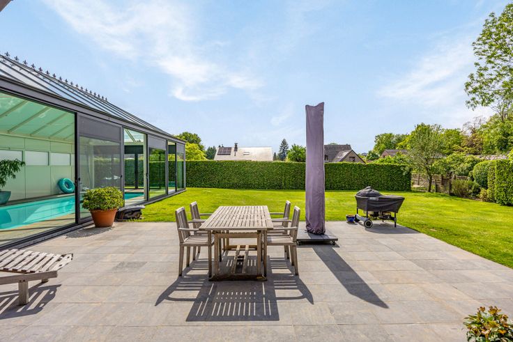Grenzend aan huis, een luxueuze veranda van 87 m² met overdekt zwembad van 9,5 m op 4 m, zwemmen met zicht op de tuin. Poolhouse omvat apart toilet met handwasbakje, 2 douches, kleine keuken met grote koelkast, micro-golfoven, inoxspoelbak. In de kelder onder zwembad technische ruimte, met nieuwe ketel voor vloerverwarming rondom het zwembad en douche, warmtepomp, ontvochtigingssysteem en filter. Prachtige tuin volledig omheind, met veel privacy dankzij de vele beplantingen. Garage en lange oprit. De warmtepomp buiten voorziet de verwarming van het zwembad. Verder is de villa uitgerust met 41 zonnepanelen, 2 regenwaterputten samen 15.000 liter, een robotmaaiersysteem voor extra luxe en genot.