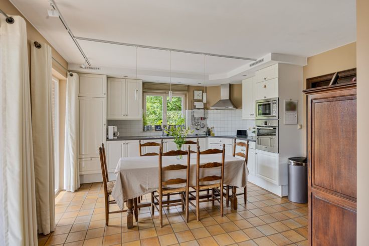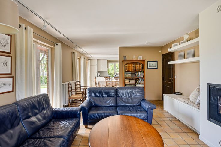 ERPS-KWERPS Energiezuinige villa op een groot perceel met private toegangsweg. Aangename indeling en lichtinval. Bestaande uit inkomhal, toilet met handwasbakje, groot bureau, dat kan gebruikt worden als slaapkamer, woonkamer met inbouwcassette voor pellets, grote schuiframen die aansluitend toegang geven tot het groot terras in blauwe steen en tuin, volledig open ingerichte keuken met koelkast, inductiekookplaat, microgolf, oven, bijkeuken/wasruimte met ingemaakte kasten. Eerste verdieping met nachthal, 3 slaapkamers, met ingemaakte kasten en 1 bureau, badkamer met ligbad, douche, dubbele lavabo en toilet, eiken vloer op het hele verdiep, stookruimte/bergruimte. Grote zolder als stockageruimte.