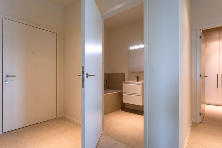 Inkomhal met ingebouwde vestiairekast en apart toilet met handwasser. Leefruimte met open, volledig uitgeruste keuken (Smeg toestellen), handige berging vlakbij de keuken. Toegang tot het verwarmde winterterras via keuken en leefruimte. Drie slaapkamers waarvan de masterbedroom met dressing en aansluitende douchekamer (dubbel lavabomeubel, inloopdouche en toilet) en twee slaapkamers met inbouwkasten. Badkamer met lavabomeubel. Ruime individuele ondergrondse kelderberging inbegrepen in de huurprijs.
