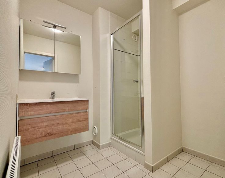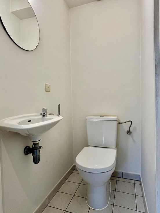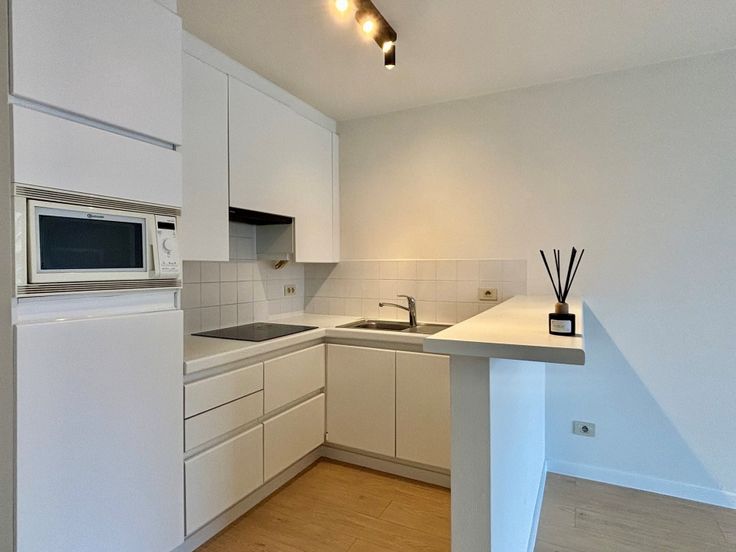 De ruime, lichtrijke leefruimte beschikt over een open keuken, uitgerust met alle nodige toestellen en veel kastruimte. Een groot schuifraam biedt toegang tot het zonnige terras. Het appartement heeft verder een apart toilet, een ruime slaapkamer, en een badkamer met wastafel, douche, en aansluitingen voor wasmachine en droogkast.