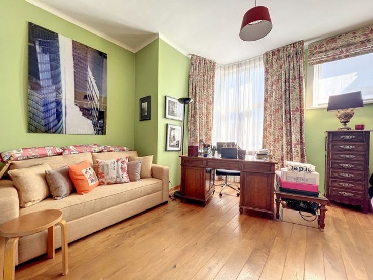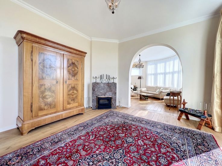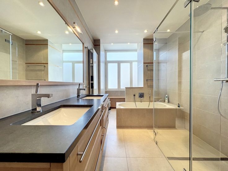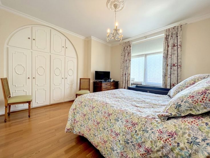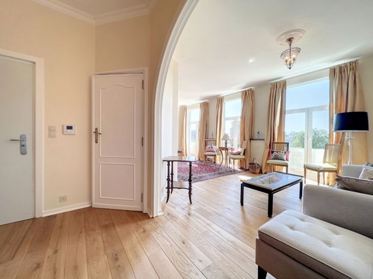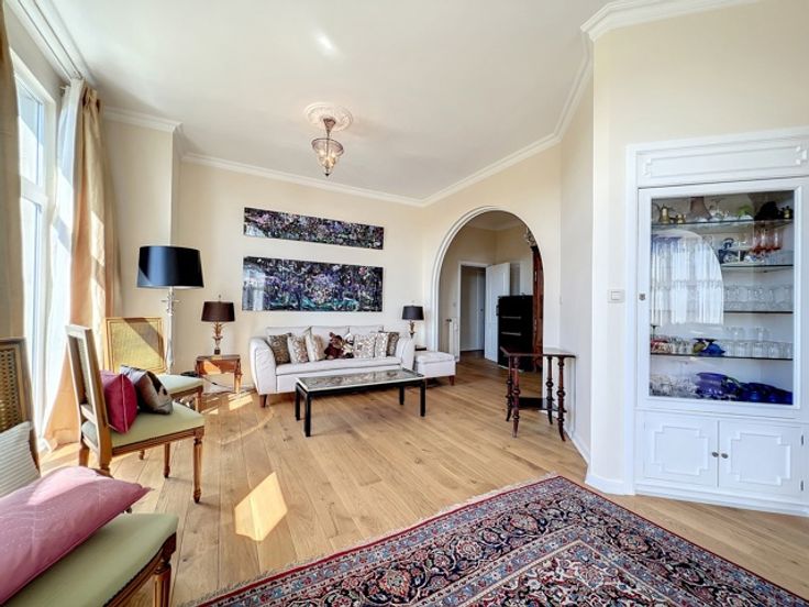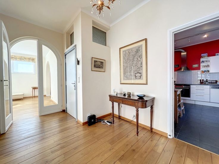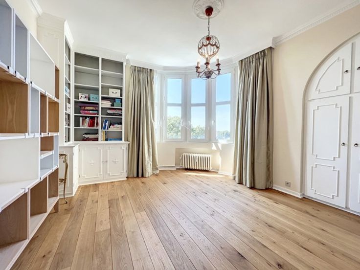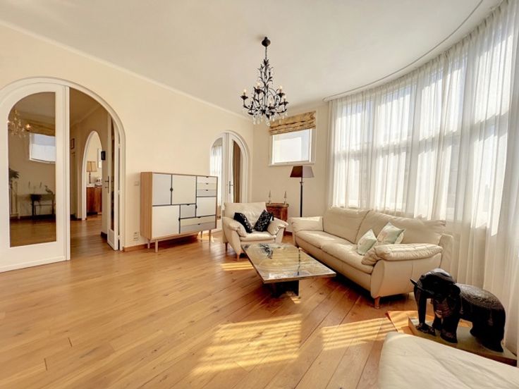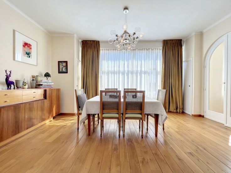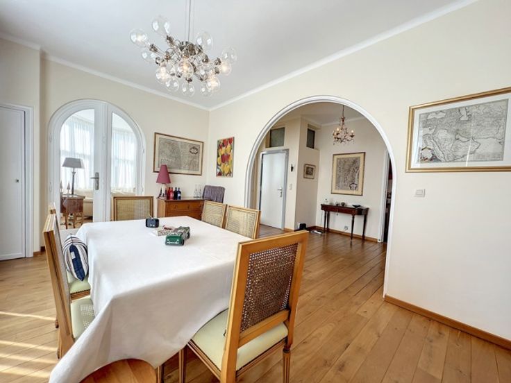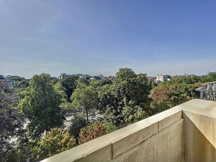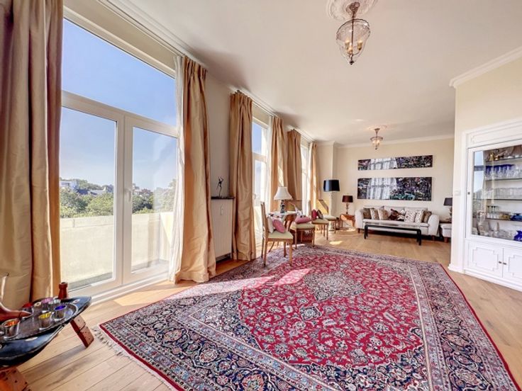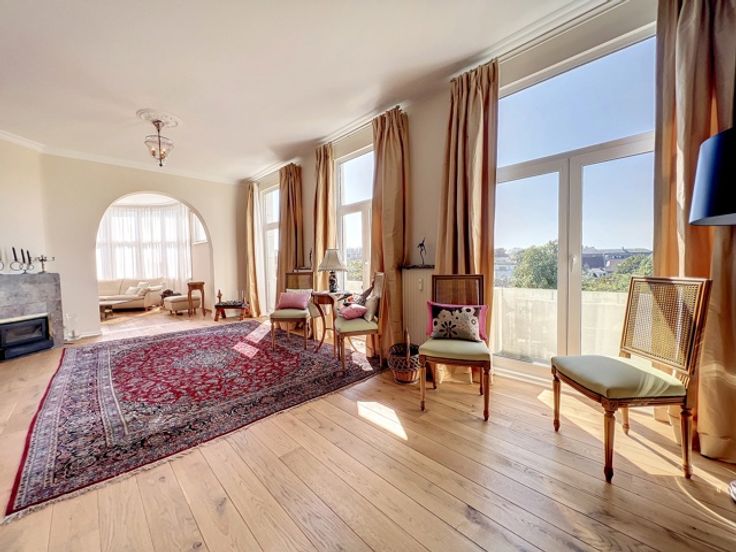 Dit prachtige appartement ligt in het hart van de prestigieuze Square Vergote en heeft een totale oppervlakte van ongeveer 215 m2. Het zal u veroveren met zijn helderheid, pracht, charme, karakter, hoge plafonds (2,9 m), geluidsisolatie en een uitzonderlijk, onovertroffen uitzicht. Het is gelegen op de 6e verdieping (met lift) van een prachtig prestigegebouw uit 1935, dat elegantie en karakter combineert met zijn stijlkenmerken. Het appartement bestaat uit een inkomhal, een eetkamer, een grote woonkamer en een ontvangstruimte van +/- 55m2 met open haard en 3 balkons (op het zuidwesten) met de hele dag door prachtig licht, een volledig uitgeruste keuken en een klein balkon aan de achterkant, een nachthal, twee grote slaapkamers, een uitzonderlijke kleedkamer, een badkamer met grote ingebouwde kasten, twee andere slaapkamers, een gastentoilet en een badkamer. Een kelder, een dienstbodekamer en een parkeerplaats voor motoren maken dit object compleet (+ €40.000 verplicht: een kelder, een dienstbodekamer en twee parkeerplaatsen achter elkaar).