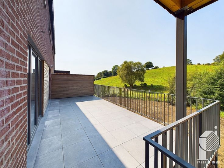 Rez :hall d'entrée, wc séparé, espace de vie ouvert comprenant cuisine, SàM et salon, une buanderie(réserve), grande terrasse. Emplacements de parking ext. + Carport + espace pour rangement des poubelles. Accès au jardin via un escalier.