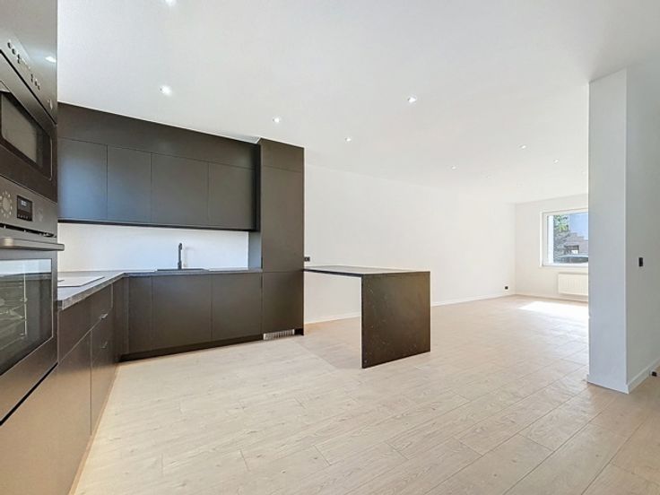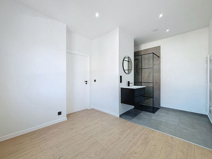Un hall d'entrée, une cuisine ouverte super-équipée, un living, une chambre avec salle de douche, une buanderie et un WC séparé.