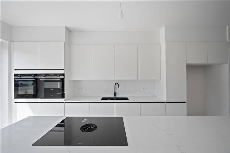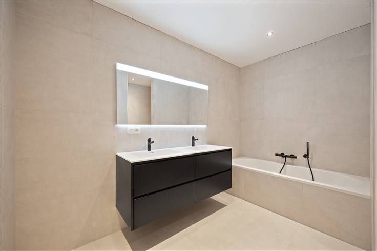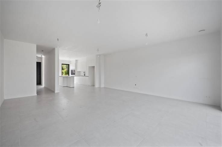 In de opengewerkte structuur van het gelijkvloers, werd de ruime eetkeuken aan de straatzijde geplaatst, zodat de woonkamer mooi uitkijkt over de tuin, via een zeer brede raampartij met zwarte alu schuiframen, voorzien van driedubbel glas. In de keuken met eiland zijn een resem kwaliteitsapparaten van Siemens voorzien: dampkap, kookplaat, vaatwasser, twee ovens, warmhoudlade, koelkast en freezer. Dankzij de kroonlijsthoogte van liefst 6,50 meter en de strakke witgrijze gelijmde gevelstenen, krijgt het huis niet alleen een imposant uiterlijk. De architect heeft het volume volledig gebruikt, wat zich laat voelen in de bouwdiepte van 13 meter, die ook is doorgetrokken op de verdieping en in de zeer ruime kelder. Deze woning wordt luxueus afgewerkt met de beste materialen, zoals bijvoorbeeld een houten trapbekleding op beton. In de master bedroom, die aan de achtergevel ligt, is gewerkt met een bijna kamerbreed groot raam. In de kamers is speciale aandacht gegaan naar de integratie van kastruimte, wat zich in de master bedroom uit in een dressingmuur en in de kamer vooraan in een soort kasthoek. De derde kamer, die is ingesloten tussen andere ruimten, is in deze woning het meest geschikt als bureelruimte. In de badkamer is plaats voor een bad, een dubbel lavabomeubel, een inloopdouche, plus een hangtoilet. Het doelpeil wordt onder meer bereikt door de combinatie van een warmtepomp (Viessmann) met veralgemeende vloerverwarming.