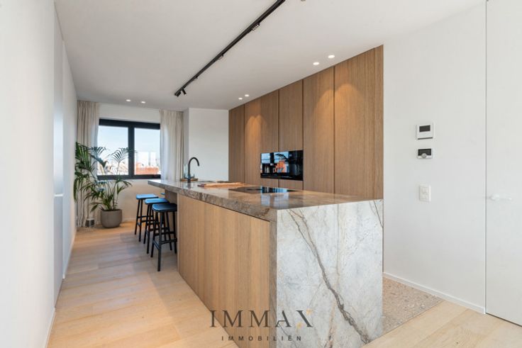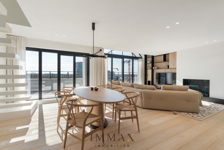 Geniet van panoramische vergezichten in deze royale, lichtrijke penthouse van ca. 155 m² in nieuwbouwresidentie 'Crown', vlak bij de zee, en de winkelstraten van Knokke. Op de benedenverdieping bevindt zich een uitnodigende inkomhall, compleet met vestiaire en apart gastentoilet. Zeer brede living met open haard en royale raampartijen. Grenzend hieraan lonkt een volledig ingerichte, open keuken met een eethoek. Het woongedeelte loopt naadloos over in een subliem zuidgerichte zonneterrassen. Op de bovenverdieping bevinden zich drie ruime slaapkamers en twee stijlvolle ingerichte doucheruimtes met toilet en dubbele lavabo.  Dit dakappartement werd zeer luxueus afgewerkt en perfect samengesteld door een gerenommeerde binnenhuisarchitect. Kortom, een oase van rust!  In de kelder kan er een staanplaats gekocht worden en is er genoeg plaats voor fietsen. Een externe ruime garagebox is ook nog mogelijk. Interesse in dit stijlvol verblijf ?  Aarzel niet om ons te contacteren via meer informatie/bezoek in te plannen via tel. :  050 62 44 14 of via knokke@immax.be