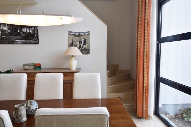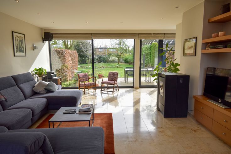 Langs links tref je het woongedeelte met de zeer lichtrijke leefruimte, de pelletkachel brengt hier extra gezelligheid.