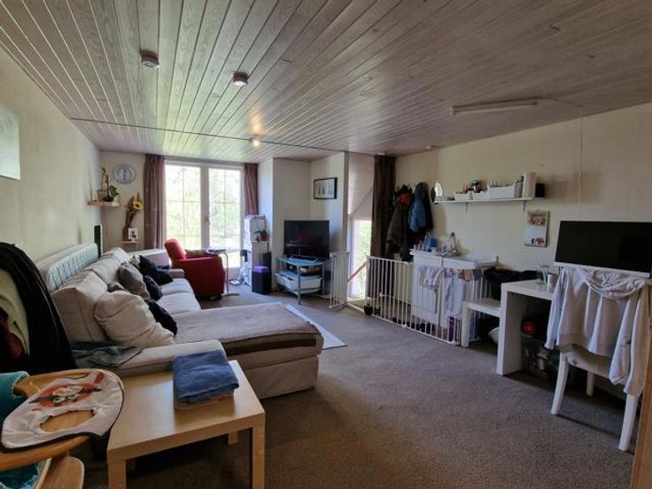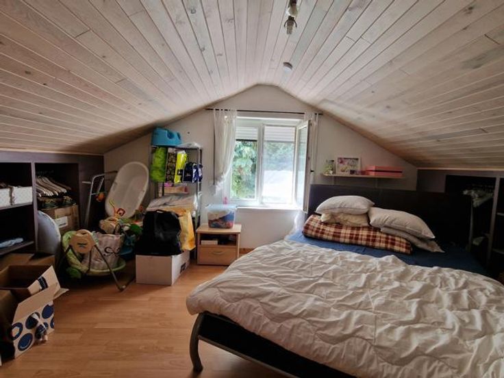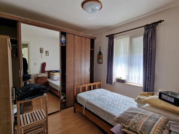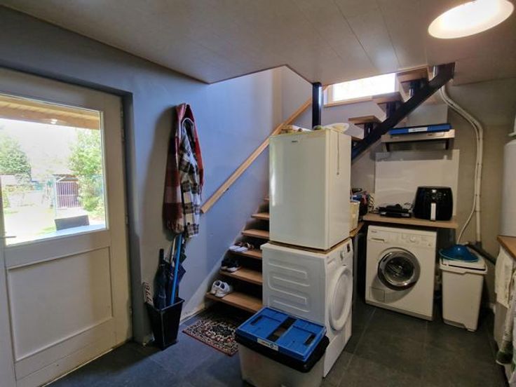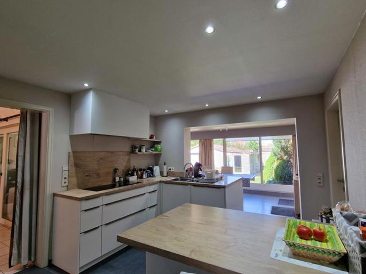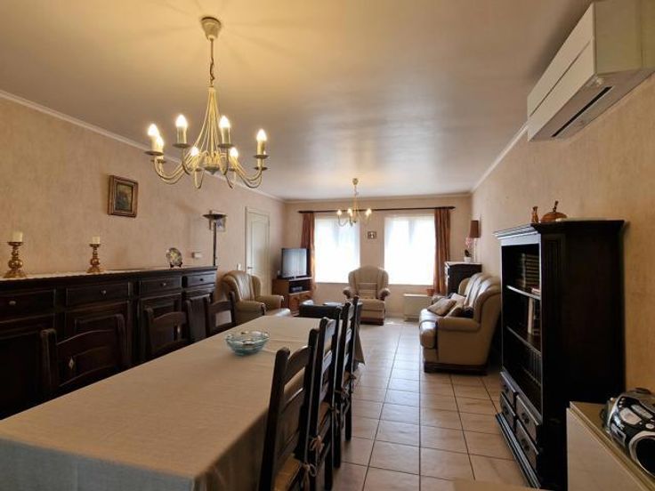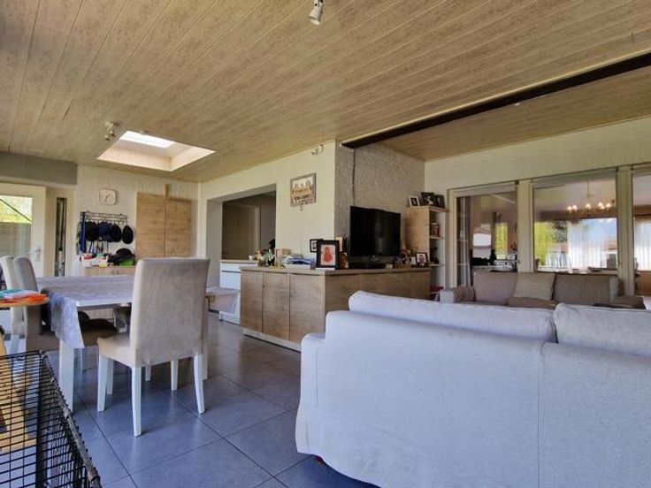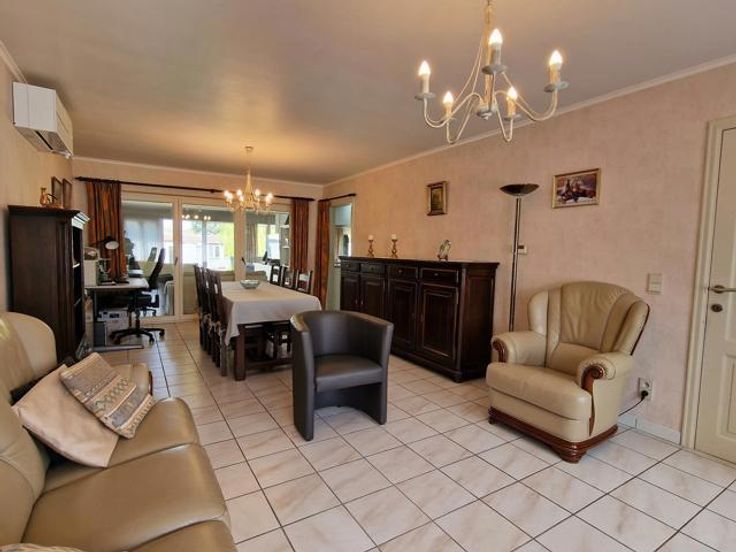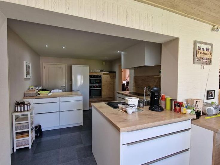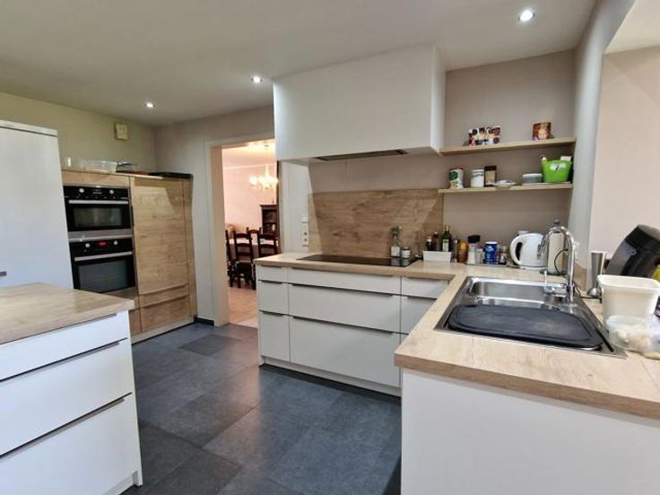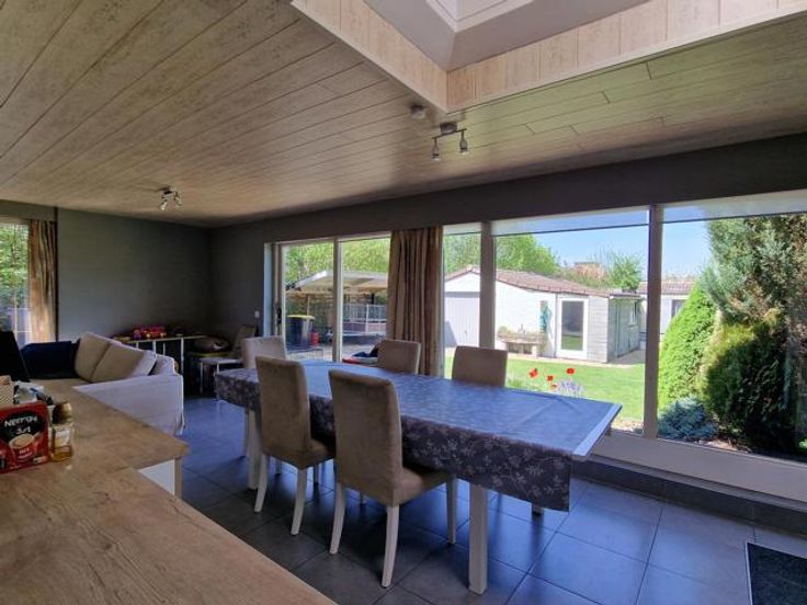 Bod vanaf 325.000 euro. We betreden deze instapklare woning via de hal met ingemaakte kast en gastentoilet. Links bevindt zich de living met salon en eetkamer. Via de volledig ingerichte open keuken komen we in de tuinkamer met grote ramen en zicht op de tuin. Rechts bevinden zich een badkamer met douche en 2 slaapkamers. Een berging bevindt zich centraal. De wasplaats bevat nog een keuken met plaats van wasmachine en droogkast. Via de trap in de wasplaats komen we op de verdieping terecht. Hier is er nog een leefruimte (eventueel op te splitsen tot 2 slaapkamers), een dressing, een slaapkamer en een ruimte geschikt voor 2e badkamer. Er is een overdekt terras. In de tuin is er een grote garage en tuinberging. Voordelen van deze woning: -Kangoeroewoning mogelijk -Levenslang wonen mogelijk -3 leefruimtes -4 slaapkamers (5 mogelijk) -Warmtepomp -De tuin is een oase van rust P-score B G-score A Geen renovatieplicht