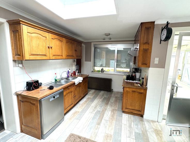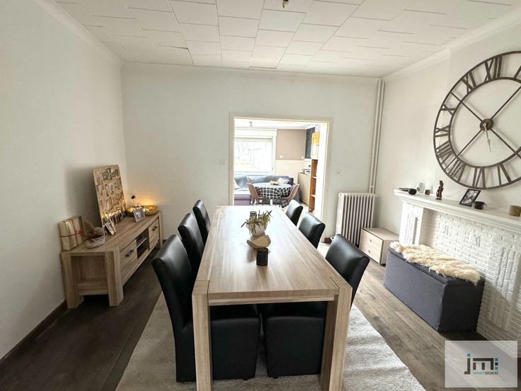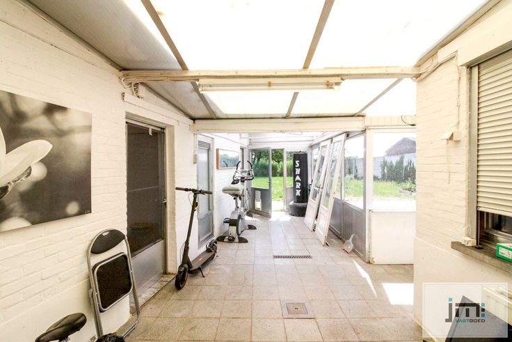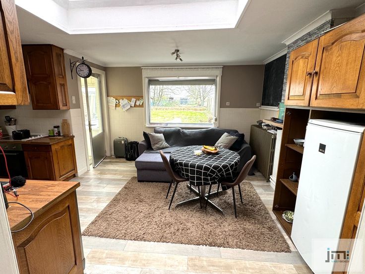 Op het gelijkvloers komen we via de inkomhal in de ruime living. Deze is opgesplitst in een zithoek en een eetkamer. Deze laatste sluit mooi aan bij de ruime keuken. Verder hebben we nog een veranda, toilet, enkele bergplaatsen en een grote garage.