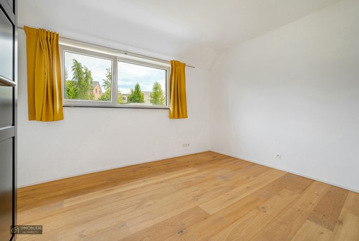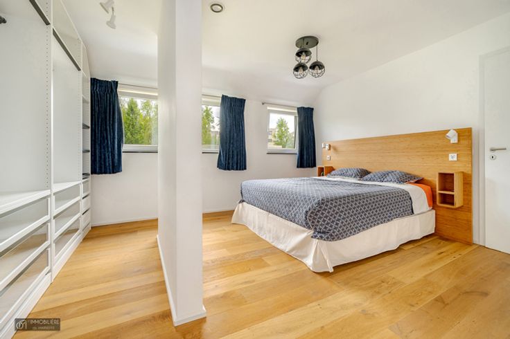 Op de 2e verdieping: Nachthal, 1 master suite van 28m² (slaapkamer, kleedkamer en badkamer (ligbad, Italiaanse douche, dubbele wastafel)), 2 slaapkamers van 12m², nog in te richten badkamer. Op de 3e verdieping: zolder van 38m² bereikbaar via een uitschuifbare trap.