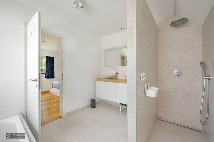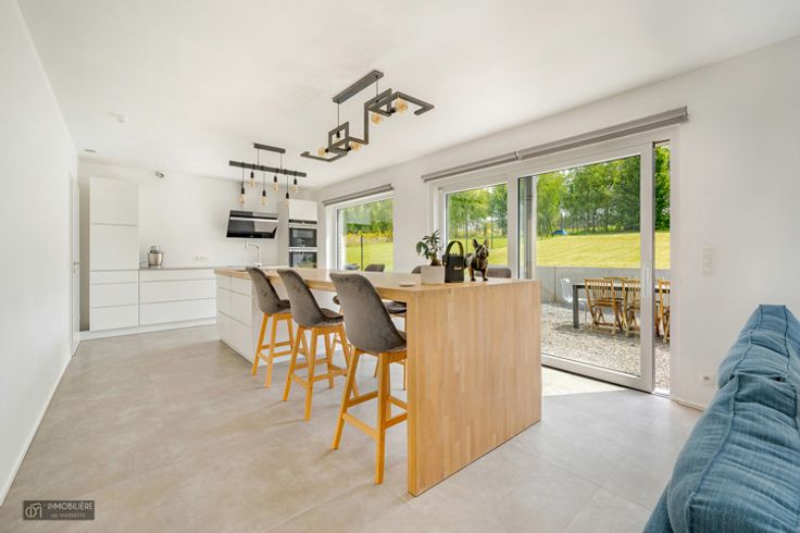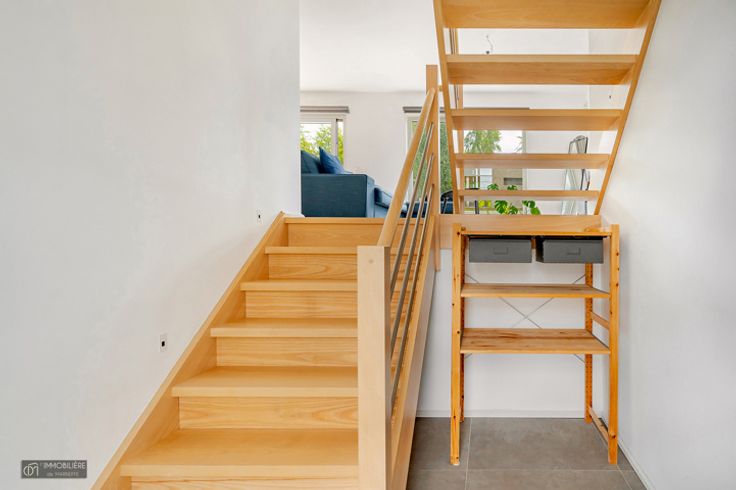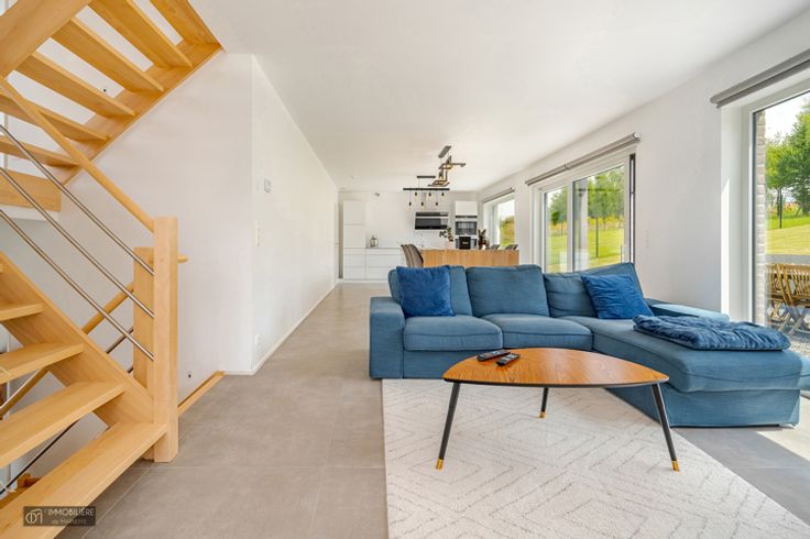Op de 1e verdieping: lichte woonkamer van 42m² inclusief moderne, volledig uitgeruste keuken (merk KVIK – koelkast, vriezer, traditionele oven en steamer, afzuigkap, magnetron, inductie en vaatwasser) en wasruimte. Het geheel kijkt uit op een zeer aangename tuin en zijn terras.