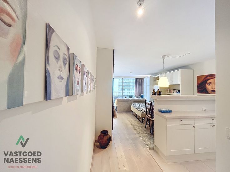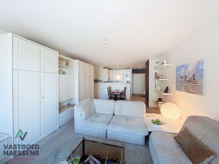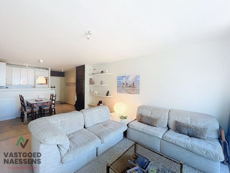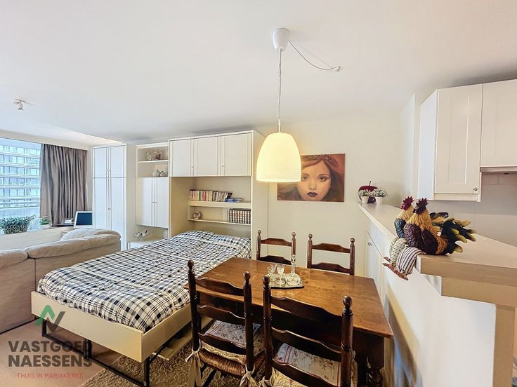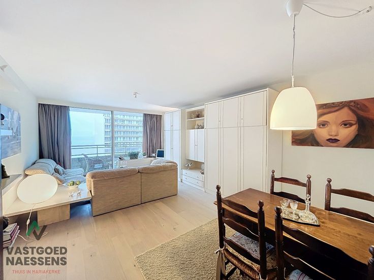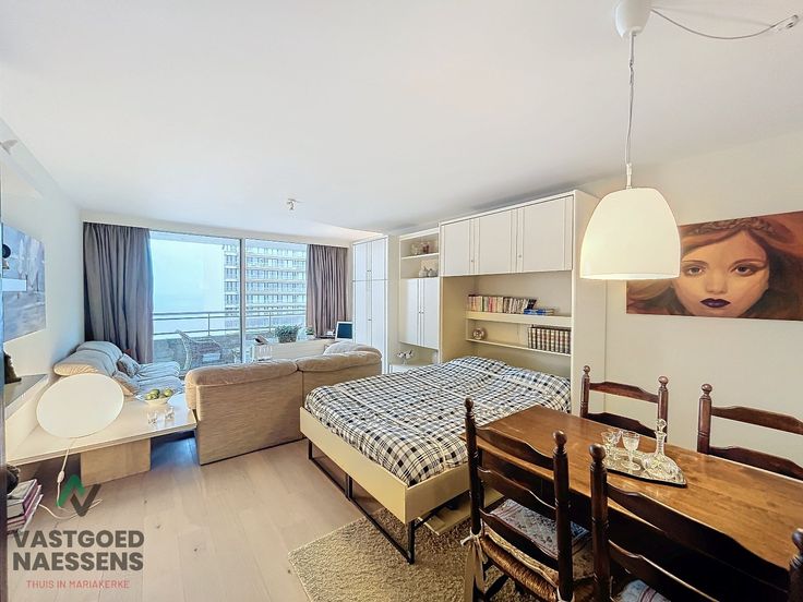De studio is als volgt ingedeeld: U komt binnen in de inkomhal die doorloopt naar de open keuken die uitgerust is van alle toestellen. Een ruime woonkamer die beschikt over kasten met bed en er is ook nog een slaapbank aanwezig. Verder heeft deze studio een terras met zeezicht en een badkamer die beschikt over een douche.