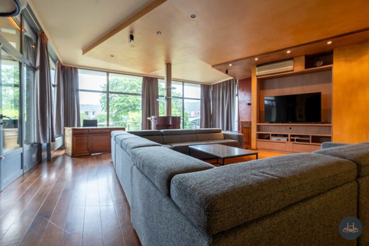 Boven de horecaruimte op de eerste verdieping bevindt zich een ruim en lichtrijk appartement met 2 grote slaapkamers. Daarenboven beschikt dit appartement over een zeer ruime woonkamer, een keuken, twee slaapkamers, een badkamer en een zeer groot terras voor privé gebruik van het appartement. De grote ramen zorgen voor veel natuurlijk lichtinval.