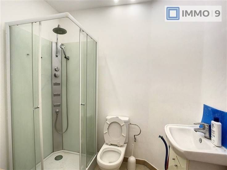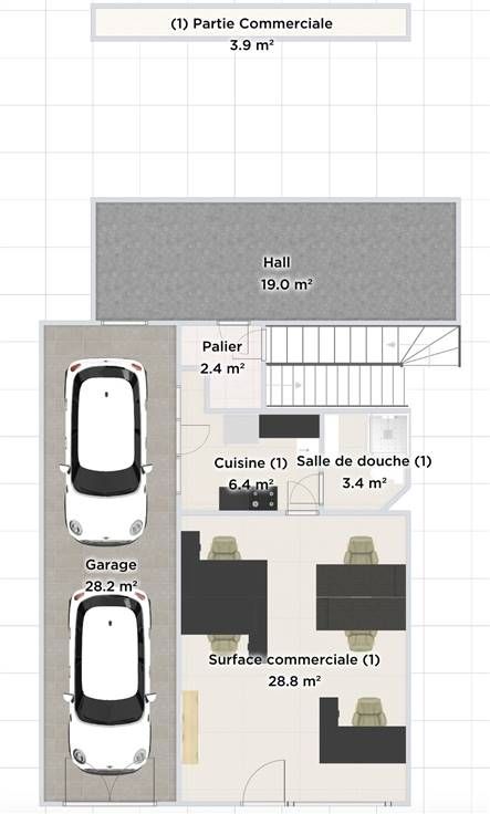 La surface commerciale situé au rez-de-chaussée est composée de la pièce principale (28 m2), d'une cuisine (6,5 m2) et d'une salle de douche (3,7 m2).