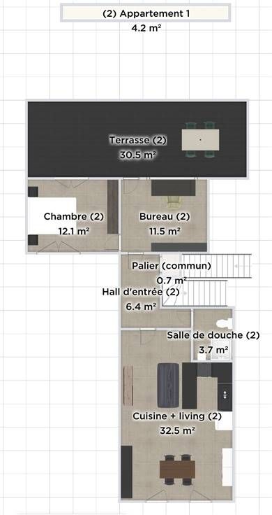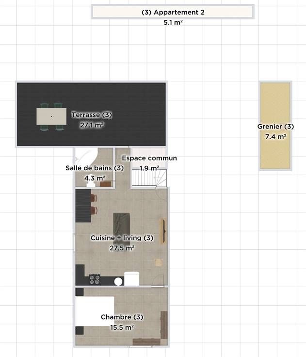 Le deuxième appartement du dernier étage est composé d'un grand espace de vie (27 m2), d'une chambre (17 m2), d'une salle de bains (4,4 m2), d'une terrasse (31,5 m2) ainsi qu'un grenier (8 m2).