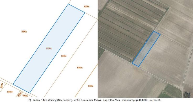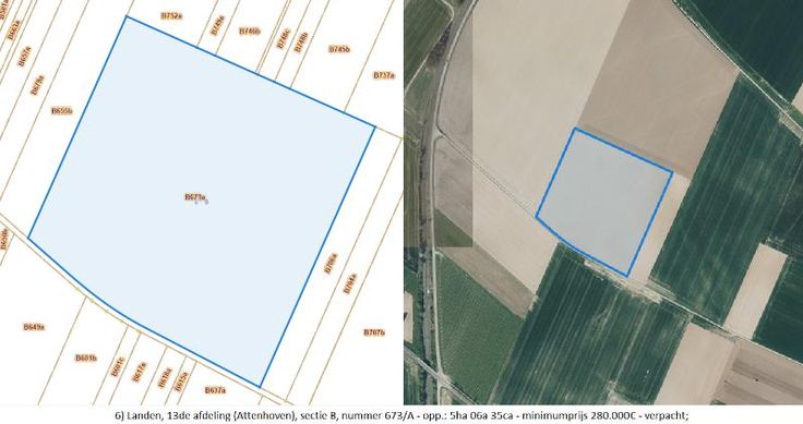 Meer dan 7 hectare landbouwgrond te koop! Verpacht (voorkooprecht). Biedingen (minstens minimumprijs) uiterlijk op 30 september 2024 in te dienen bij notaris Kris Pexsters. 3) Landen, 14de afdeling (Neerlanden), sectie B, nummer 159/A - opp.: 99a 26ca - minimumprijs 40.000€ - verpacht; 6) Landen, 13de afdeling (Attenhoven), sectie B, nummer 673/A - opp.: 5ha 06a 35ca - minimumprijs 280.000€ - verpacht. Voor meer info : ten kantore of https://www.sint-truiden.be/gronden-buiten-sint-truiden P score: B