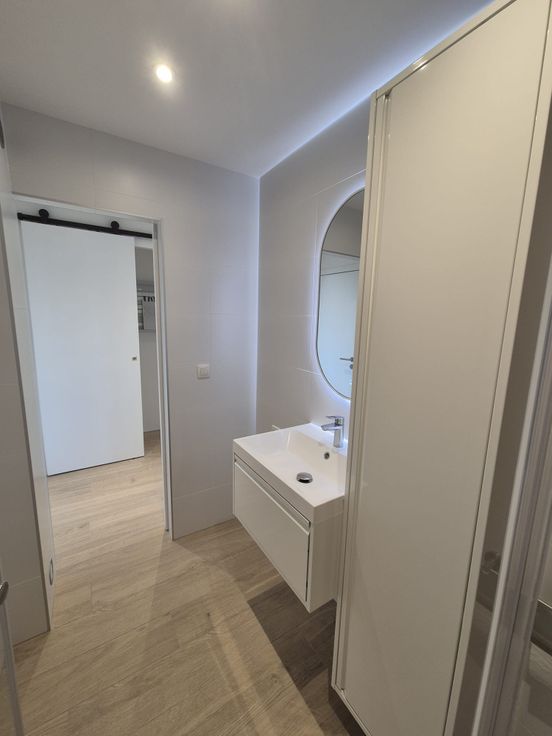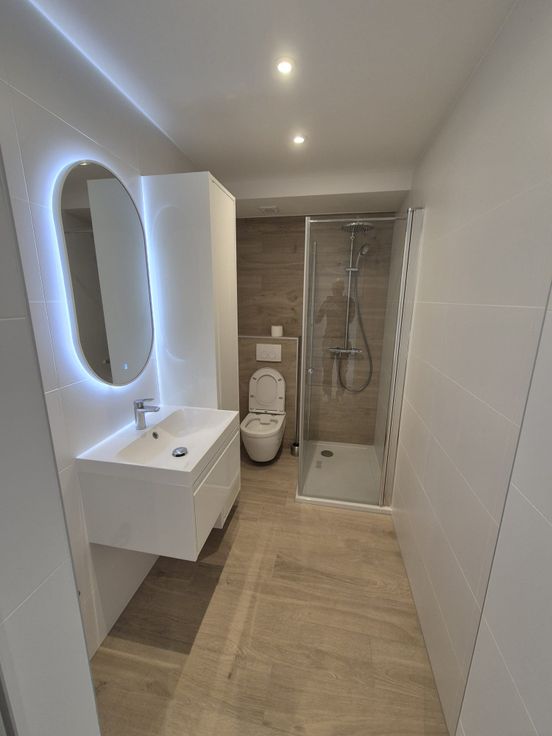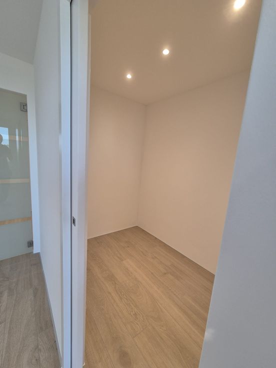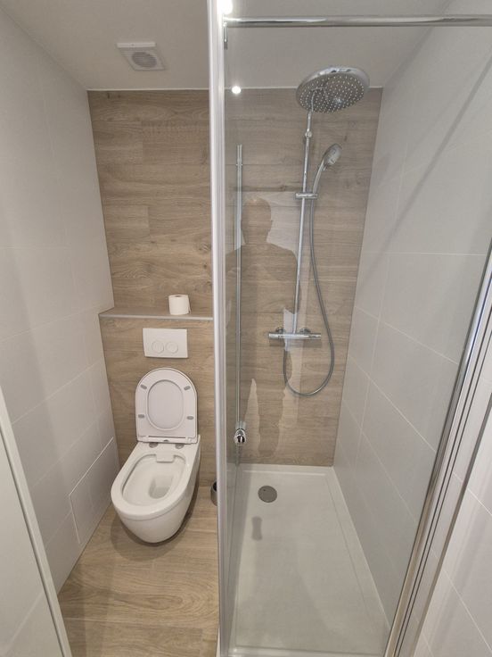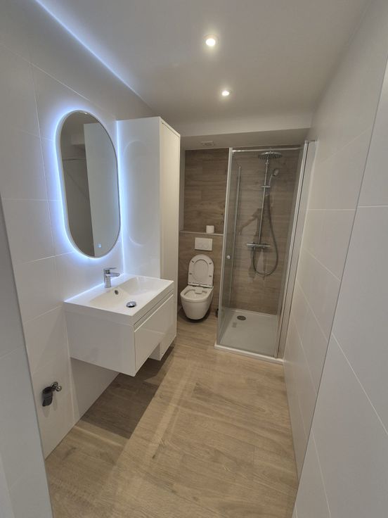 Er is ook een prachtige doucheruimte met een regendouchecabine en thermostaatkraan, toilet, wastafel met lade en opbergkolom voor al uw toiletartikelen. Er is ook ruimte voor een wasmachine.