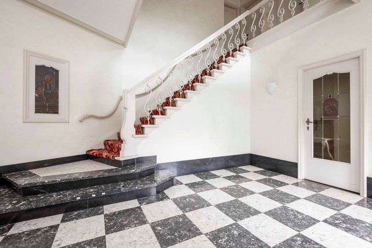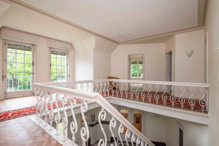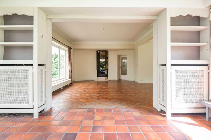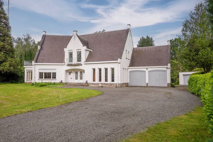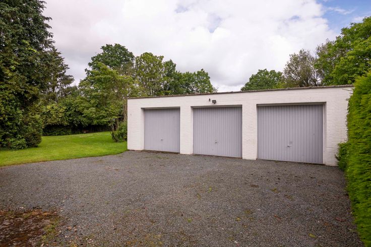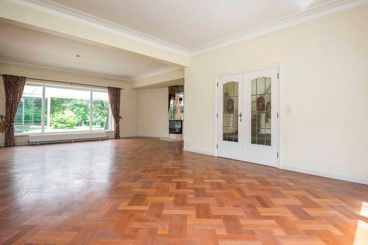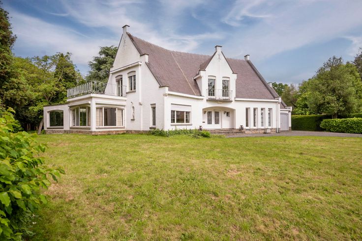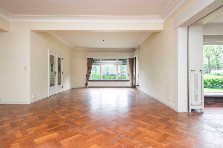Indeling gelijkvloers: U komt de woning binnen via een ruime inkomhal met een statige trap naar bovenverdieping met open omloop. Aan de linkerzijde gaat u via een dubbele deur naar een zonnige living van 90m² op parket met open haard en een beschut gelegen serre. De living heeft toegang tot de eetkamer die via een tuindeur aansluit op een groot overdekt terras met uitzicht over de tuin. Via de eetkamer komt u ook in een te renoveren keuken (ca. 20m’) met verhoogd uitzicht op de tuin. Een kleine gang, met daarin toegang tot enkele grote kelders en gastentoilet, leiden u terug naar de inkomhal. Deze gang is tevens verbonden met afgesloten gang naar het bureel met ingebouwde boekenkast over volle lengte (8 meter). Dit bureel kijkt uit over de grote voortuin met oprijlaan. Via deze gang ook toegang tot inpandige garage voor 2 auto’s.