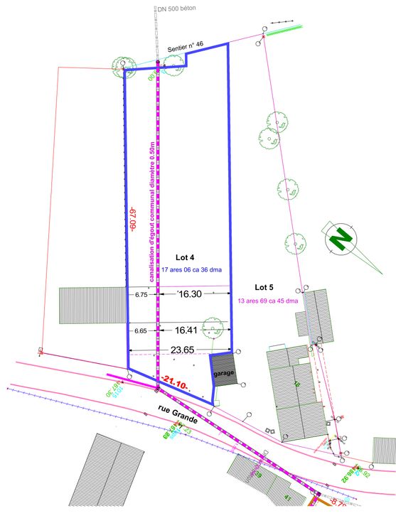Beau terrain à bâtir plat orientation arrière Sud-Ouest; largeur 23.65m. Autorisation de de construire sur l'égout communal sans appuis sur celui-ci.