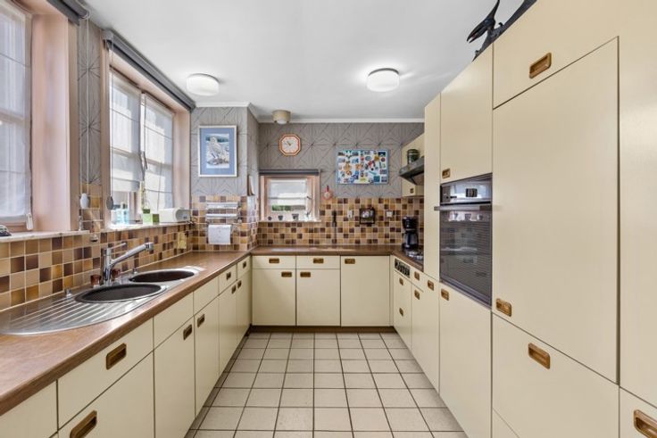 Gelijkvloers: Inkomhal met gastentoilet, ruime en lichtrijke leefruimte, zithoek met tuinzicht, knusse tv-hoek, volledig uitgeruste keuken met eethoek, praktische berging en ruime inpandige garage (18 m²).
