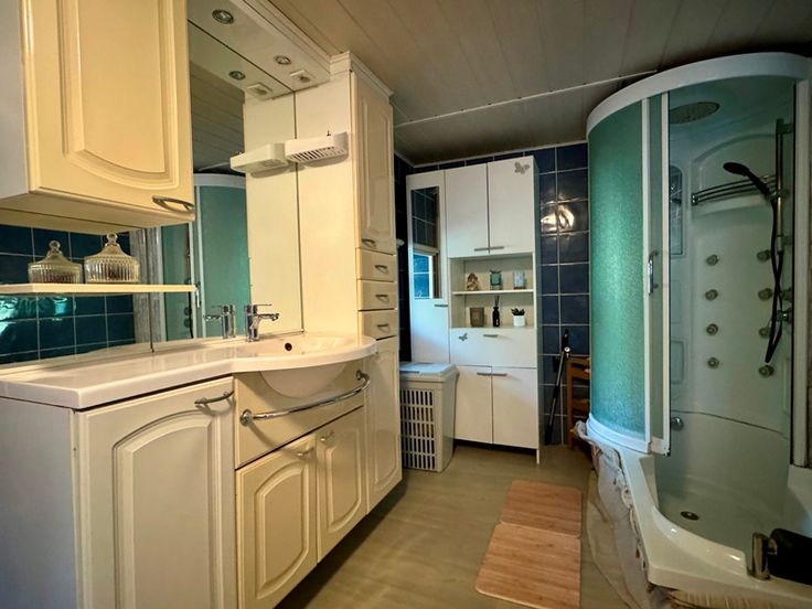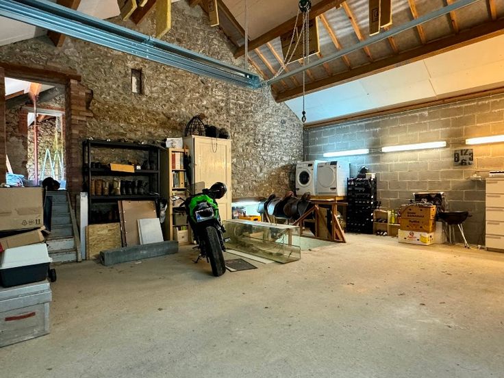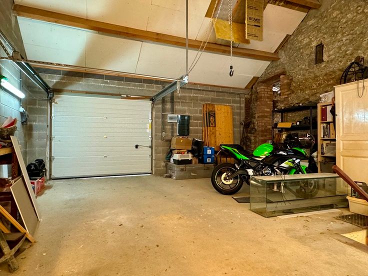 Au rez: vaste séjour lumineux de 38m² avec accès terrasse, cuisine indépendante de 25m² avec espace déjeuner et accès terrasse (taques vitrocéramiques, frigo-congélateur, hotte, lave-vaisselle et double éviers), salle de bains de 7m² (baignoire/douche, WC et lavabo), garage 2 voitures de 44m² avec coin atelier et porte sectionnelle motorisée.