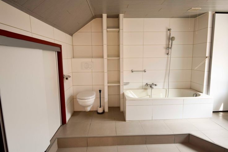 een grote badkamer (2017) met ligbad, wasmeubel, inbouwkast en toilet.