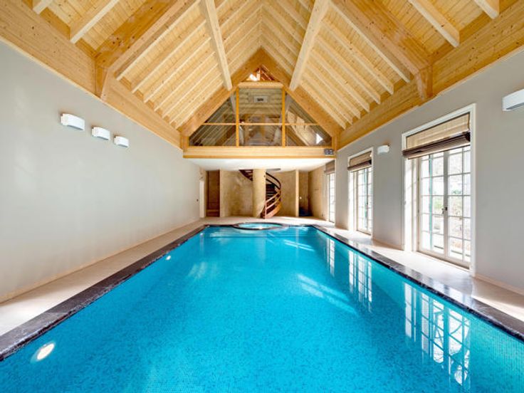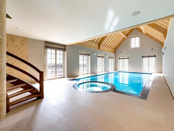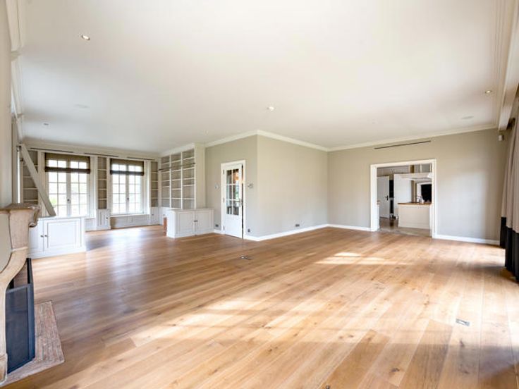 Ruime entreehal, volledig geïnstalleerde woonkeuken met eiland, eethoek en gashaard, leefruimte onderverdeeld in een salon met open haard, een bibliotheek en eetkamer, studeerkamer met open haard, inpandig zwembad met wellness en directe toegang tot de verdieping met fitness in een geklimatiseerde ruimte met uitzicht over het zwembad.
