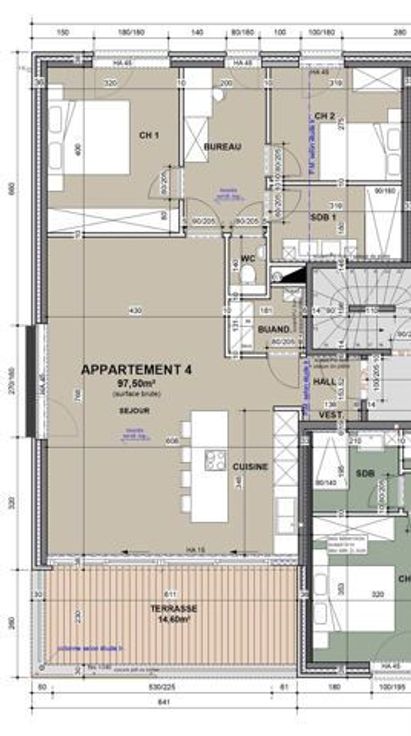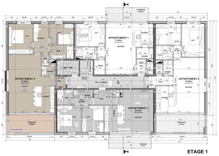 Immeuble de 8 appartements avec un rez-de-chaussée destiné à des bureaux ou une activité de profession libérale. Les appartements sont composés de : cuisine, salon, salle à manger, buanderie, hall de nuit, salle de bain, 1 ou 2 chambres, terrasse et cave au sous-sol.