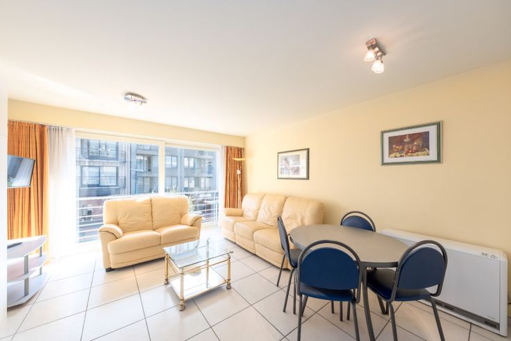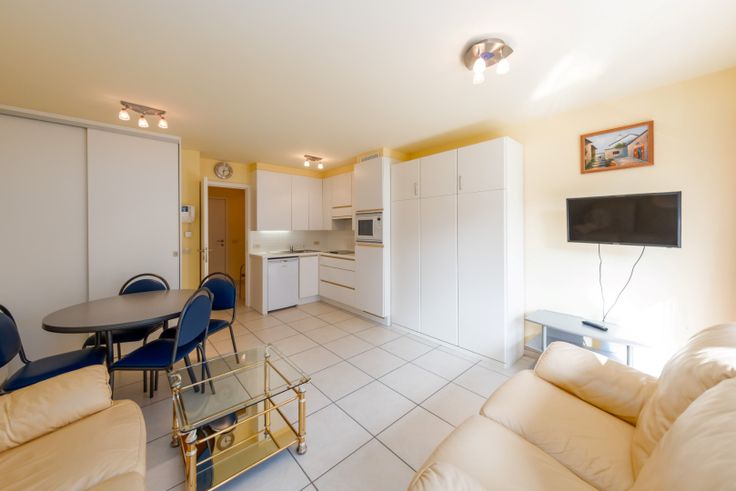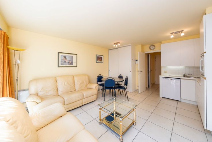 Indeling: inkomhal met vestiaire, ruime zonnige woonkamer met uitklapbaar bed, eettafel en salon; terras, open ingerichte keuken, badkamer met enkele lavabo en bad/douche.