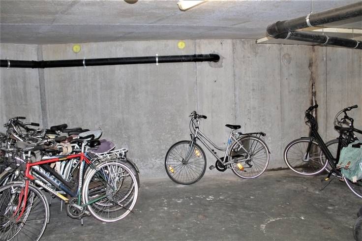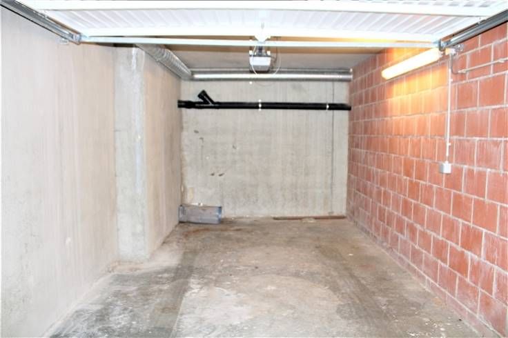 Ondergrondse garage (elektrische poort) met twee gemeenschappelijke bergingen om fietsen te stationeren op een bijzondere goede ligging. Verlichting en een stopcontact aanwezig. info 0496 10 62 97