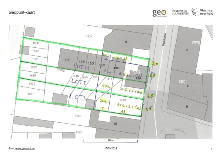 Deze projectgrond is gelegen aan de Vendoorn, een mooie ligging tussen Zwijndrecht en Melsele.Zeer goed bereikbaar met de auto en met het openbaar vervoer (tram/bus).De 14 percelen zijn momenteel bebouwd met 6 kleine te slopen woningen.Na herverkaveling zijn ze cfr. het pré-advies van de gemeente Zwijndrecht geschikt voor 3 huizen (2 gesloten en en 1 halfopen bebouwing).Pré-advies bouwmogelijkheden:Optie 1:Een gesloten woning met een gevelbreedte van 6m zonder garageEen gesloten woning met een gevelbreedte van 6,5m met inpandige garageEen halfopen woning met een gevelbreedte van 5,8m met garage in de bouwvrije zijdelingse strook van 3m.Optie 2:Een gesloten woning met een gevelbreedte van 6,5m met inpandige garageEen gesloten woning met een gevelbreedte van 6,5m met inpandige garageEen halfopen woning met een gevelbreedte van 5,3m met garage in de bouwvrije zijdelingse strook van 3m.Bouwdiepte:Gelijkvloers: 17 mVerdiep: 12 mZadeldakPS: de gevelbreedte is een verdeling op basis van niet nagemeten afmetingen.Contacteer zwijndrecht@dewaele.com voor meer informatie !