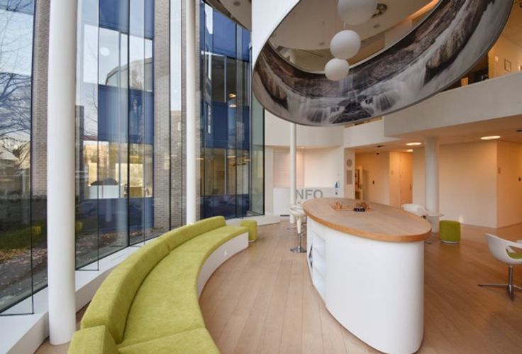 Gebouw met 2439 m² kantoorruimte, opgebouwd uit 3 vloeren met telkens 2 vleugels en een ruime moderne inkomhal.
