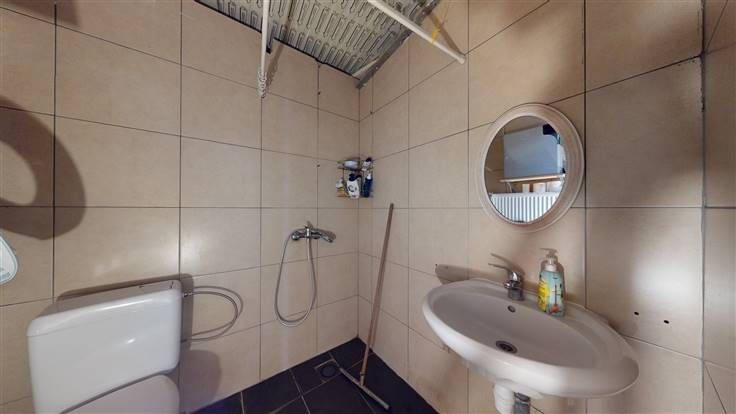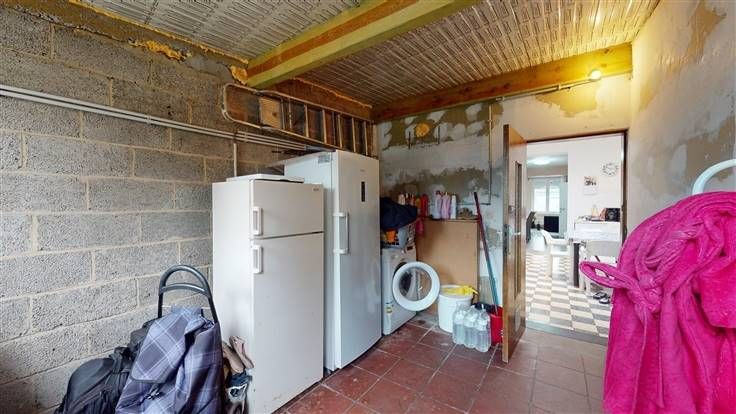 Vanuit de keuken is er toegang tot een grote berging van iets meer dan 16m². Achter is nog een koer. In de keuken werd een lichtkoepel geinstalleerd.